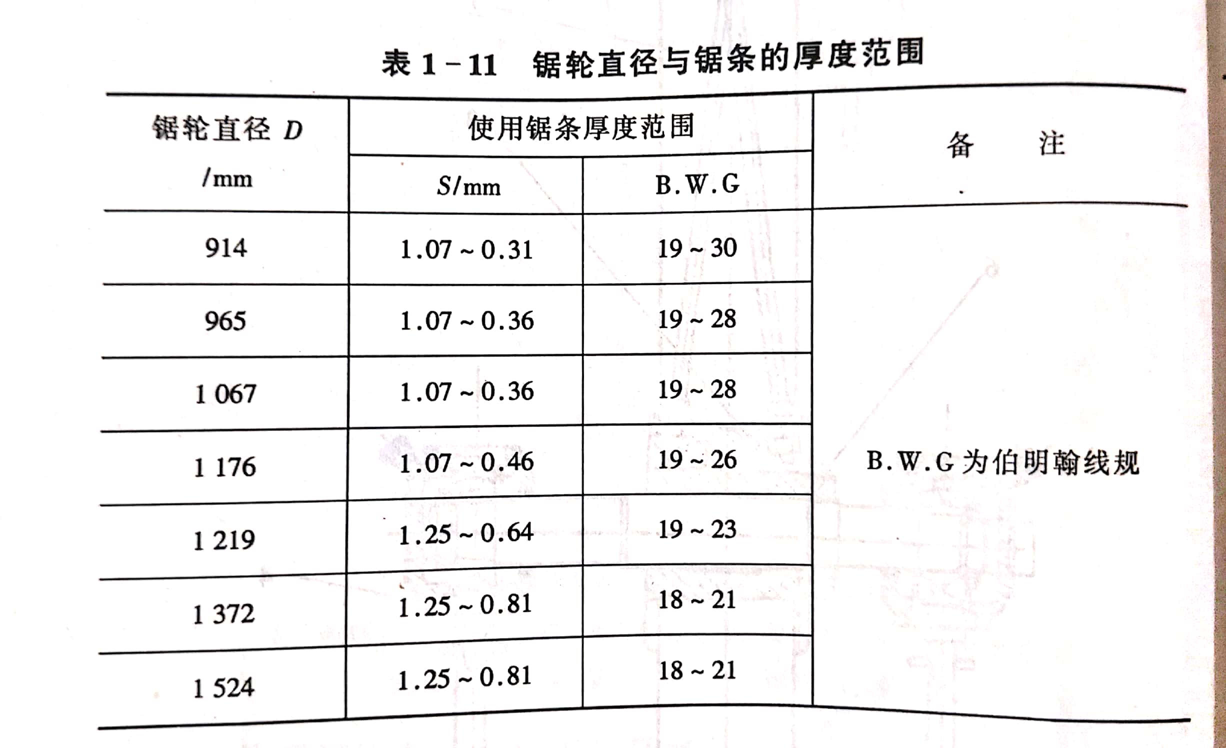 鋸輪直徑與鋸條厚度關(guān)系見表1-11