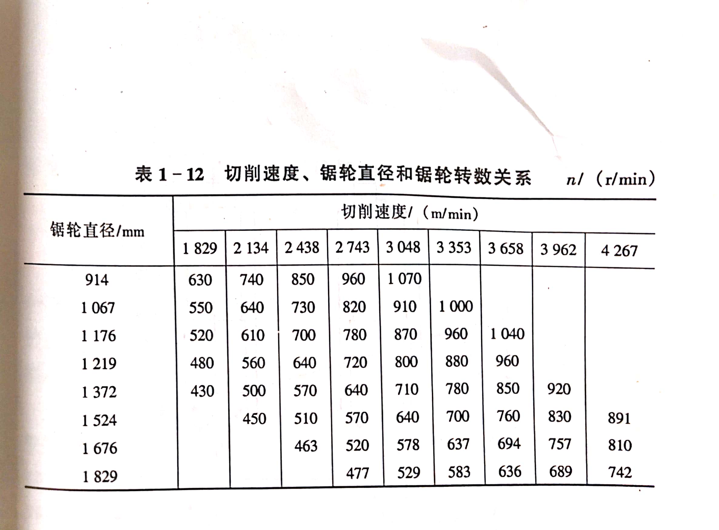 (3)切削速度與鋸輪直徑的關(guān)系:帶鋸機鋸割木材的切度一經(jīng)確定,則一定直徑的鋸輪轉(zhuǎn)速也就確定下來,切圖速度鋸輪直徑與鋸輪轉(zhuǎn)數(shù)的天系列入表1-12