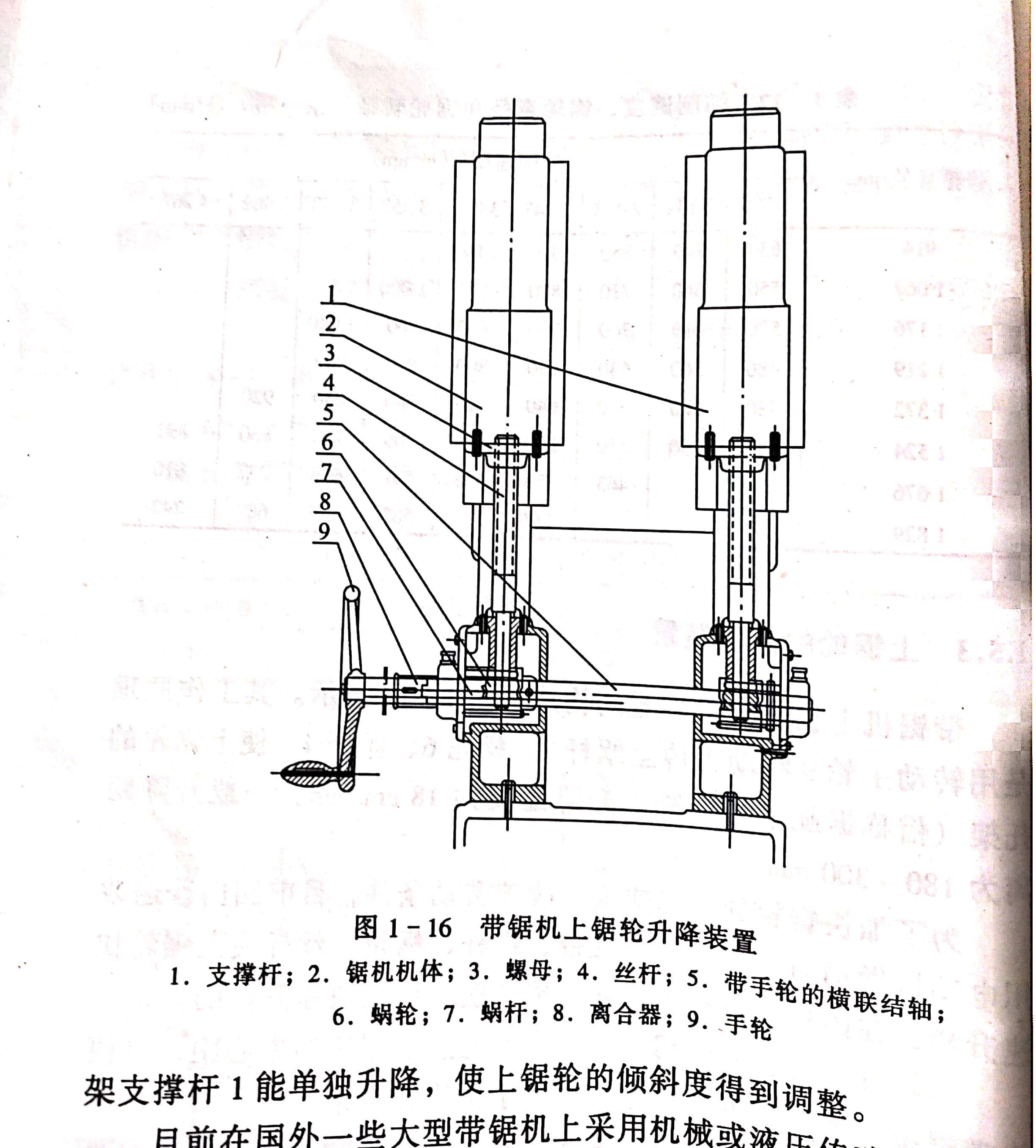 為了防止鋸條從鋸輪上脫落下來,并能抵抗鋸切時木材對帶鋸條鋸齒的壓力,使鋸條穩(wěn)定在鋸輪上一定的位置,上鋸輪必須稍向前傾斜。實現(xiàn)鋸輪向前傾斜是靠上鋸輪的升降機構(gòu)來完成,這是鋸輪升降裝置的另一作用。調(diào)整時將離合器拉開(圖1-16),轉(zhuǎn)動手輪9時,由于蝸桿7空套在手輪軸5上,所以只有右邊的一對蝸輪蝸桿起作用。當(dāng)右邊絲杠旋轉(zhuǎn)時,右邊的鋸輪托架支撐桿1能單獨升降,使上鋸輪的傾斜度得到調(diào)整。
